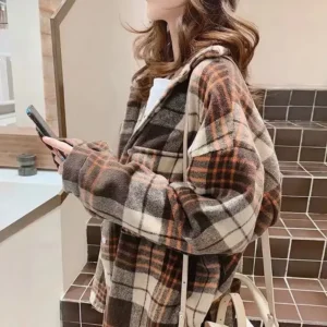 Autumn Winter New Style Student Korean Version Woolen Coat V-neck Cotton Shirt Retro Hong Kong Style Plaid Shirt Women’s Loose