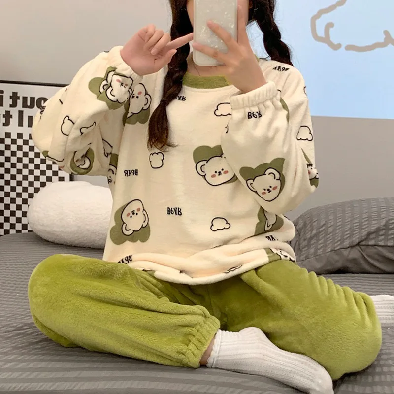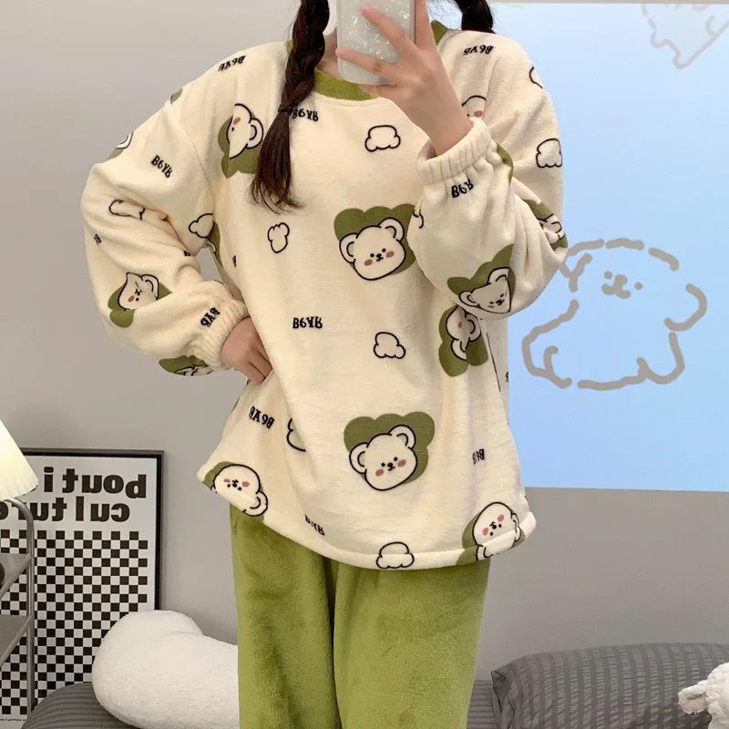 Flannel Warm Pyjamas Set for Women’s Padded Plus Size Student Nightwear Ladies Sweet Breathable Crew Neck Sleepwear Loungewear